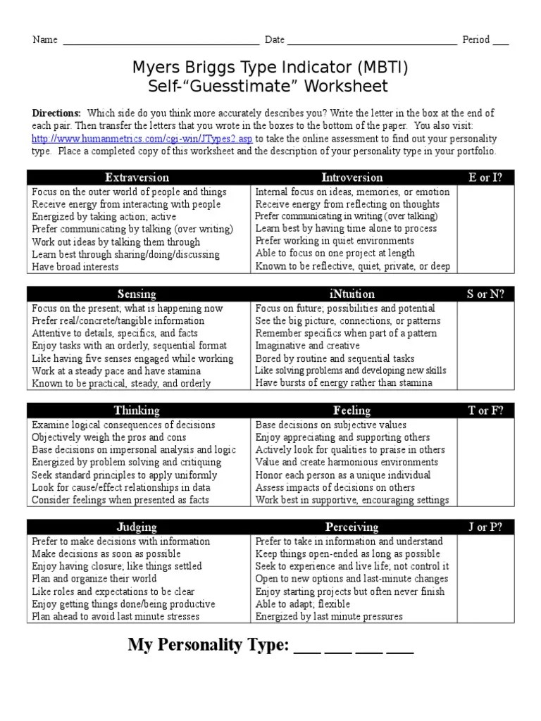 Myers Briggs Worksheet / Mbti Reflection Worksheet 1 Jacob Bartley Self Assessment Reflection Worksheet Please Complete This Guided Reflection Of Your Mbti Assessment Course Hero -